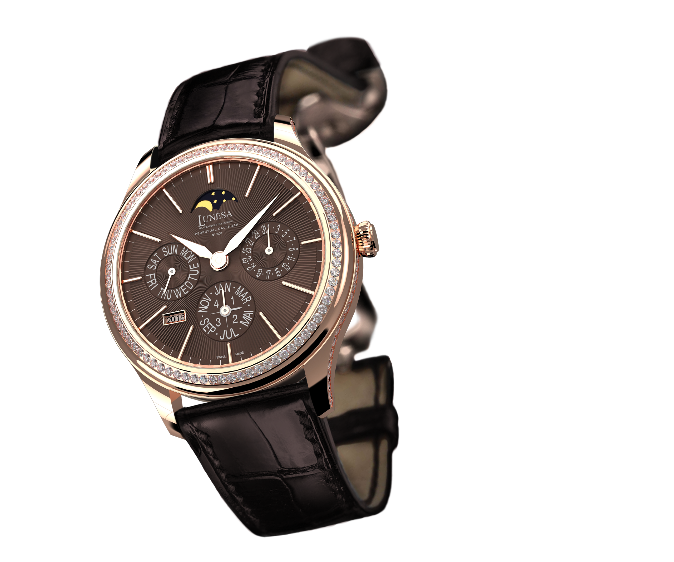 PRODUCT DETAILS:Ref: L500066RG 3904-484/3782Mechanical self winding movementCaliber L484PCPerpetual calendarDay, date, month and leap year indication by handYear indication by windowMoon phases indicationGold dial, gold applied hour markersCase set with 88 diamonds (~1.42 ct.)Sapphire-crystalCase is humidity, dust and water resistant protectedCase in rose goldCase diameter: 37 mm MOVEMENT:Mechanical self winding movementCaliber L484PCPerpetual calendar: day, date, month, leap year and moon phasesDiameter: 26 mmJewels: 25Power reserve: 48 hoursVibrations/hour: 28 800 (4 Hz)
